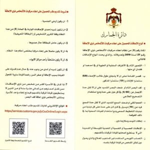 نشامى الاخباري – نشرت دائرة الجمارك الأردنية التعليمات الخاصة بشروط منح إعفاء مركبات للأشخاص ذوي الإعاقة.