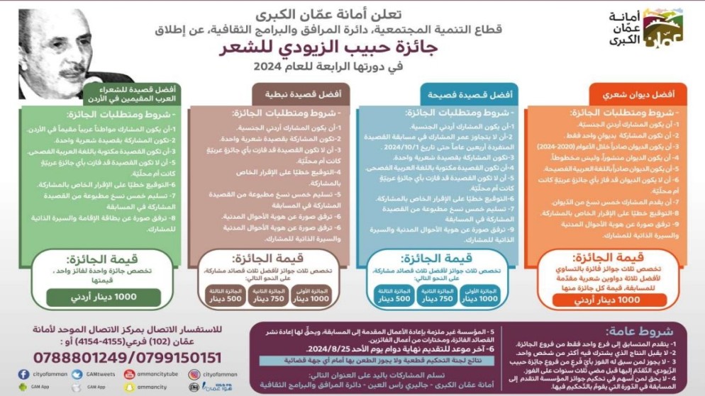نشامى الاخباري ـ أطلقت دائرة المرافق والبرامج الثقافية قطاع التنمية المجتمعية بأمانة عمان الكبرى جائزة حبيب الزيودي للشعر في دورتها الرابعة للعام الحالي.