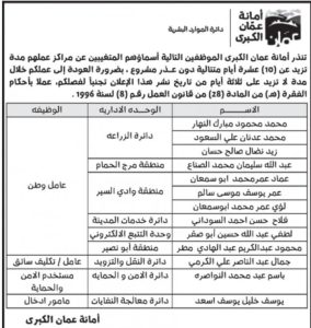 وبينت الأمانة، إنه “وبسبب تغيبكم عن مركز عملكم مدة تزيد عن 10 أيام متتالية دون عذر مشروع، فإنني أنذركم بضرورة العودة إلى العمل خلال مدة لا تزيد عن 3 أيام من تاريخه، وإذا تخلفتم عن العودة سيتم فصلكم عملا بأحكام الفقرة (ه) من المادة (28) من قانون العمل رقم (8) لسنة 1996”.