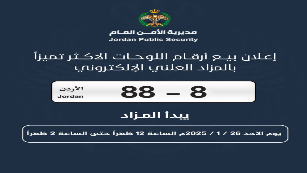 نشامى الاخباري_ أعلنت إدارة ترخيص السواقين والمركبات بالتنسيق مع وزارة المالية واستنادًا إلى أحكام نظام لوحات المركبات وتعديلاته رقم (52) لسنة 2006 عن طرح مجموعة من الأرقام الأكثر تميزًا المبينة في الجدول أدناه للبيع بالمزاد العلني الإلكتروني من خلال الموقع الإلكتروني لإدارة ترخيص السواقين والمركبات www.dvld.gov.jo.