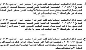 نشامى الاخباري - صدرت الإرادة الملكية السامية بالموافقة على قرارات مجلس الوزراء المتضمنة تعيين 3 سفراء ، على النحو التالي :