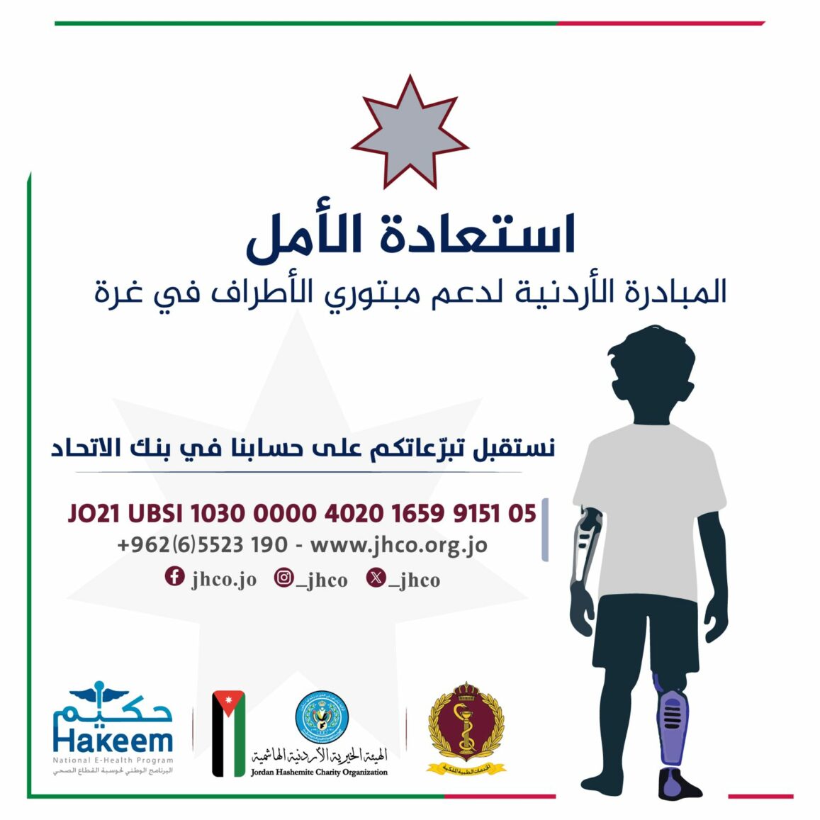 نشامى الاخباري_ أعلنت الهيئة الخيرية الأردنية الهاشمية عن فتح الباب لاستقبال التبرعات النقدية ضمن المبادرة الأردنية “استعادة الأمل” لدعم مبتوري الأطراف بغزة.