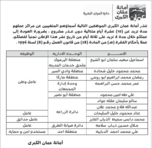 نشامى الاخباري – أنذرت أمانة عمان الكبرى، الأربعاء، 11 عامل وطن وموظفا، بالعودة إلى عملهم خلال 3 أيام، وإلا سيتم فصلهم نتيجة تغيبهم عن العمل لمدة تزيد عن 10 أيام، وذلك عملا بأحكام الفقرة “هـ” من المادة “28” من قانون العمل رقم “8” لسنة 1996.