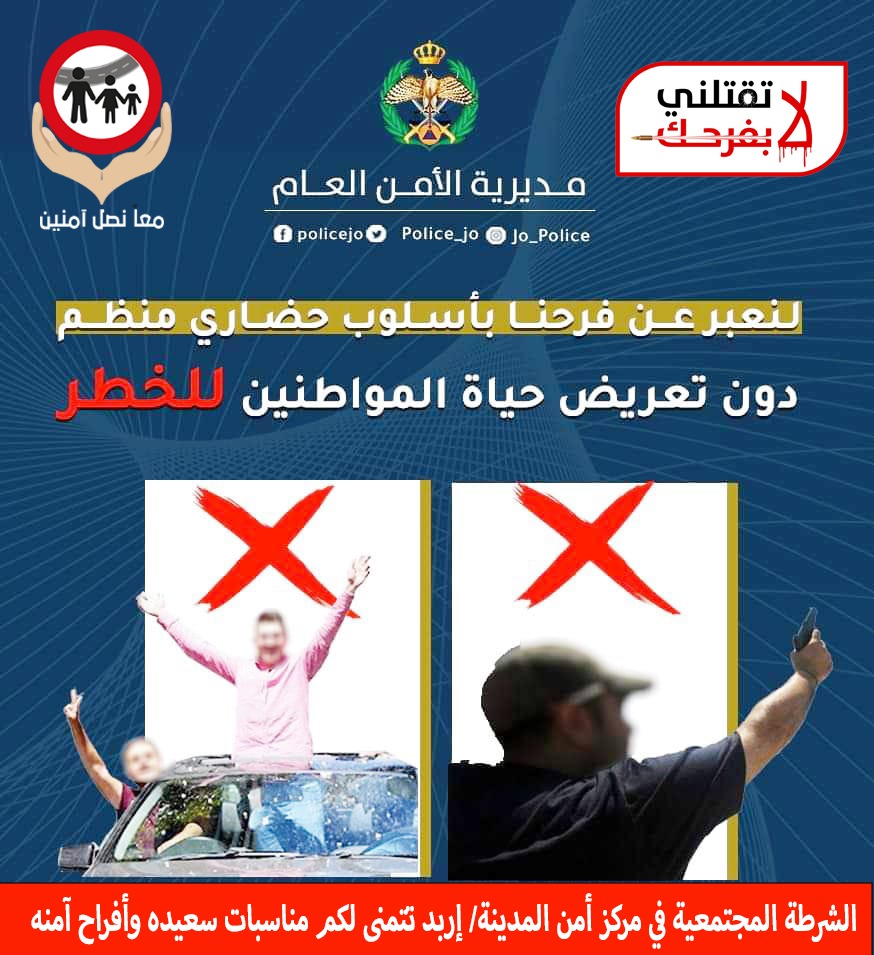نشامى الإخباري_ نشرت الشرطة المجتمعية/ مديرية الأمن العام عبر صفحتها اليوم الخميس، منشور توعوي استمرارا لحملة “لا تقتلني بفرحك”، تزامنا مع موعد إعلان نتائج الثانوية العامة.