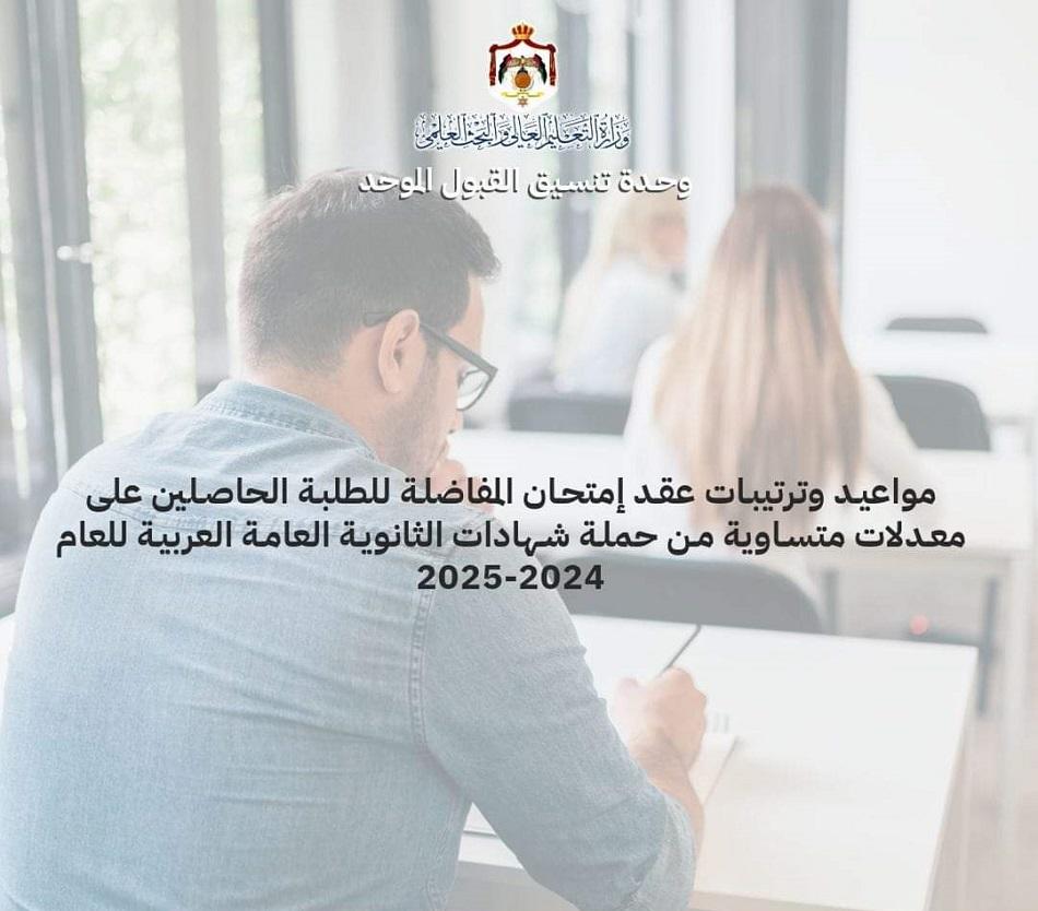 نشامى الاخباري_ أعلنت وحدة تنسيق القبول الموحد في وزارة التعليم العالي، الأحد، موعد وترتيبات عقد امتحان المفاضلة المقرر للطلبة الأردنيين الحاصلين على معدلات متساوية في شهادة الدراسة الثانوية العامة العربية للعام الجامعي 2024-2025.