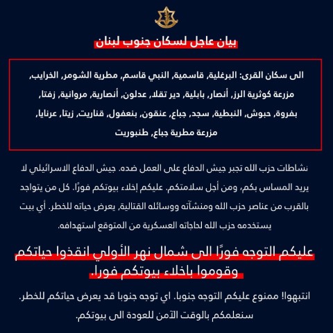 وقال الجيش في بيان: “إلى سكان جنوب لبنان في القرى التالية: البرغلية، قاسمية، النبي قاسم، مطرية الشومر، الخرايب، مزرعة كوثرية الرز، أنصار، بابلية، دير تقلا، عدلون، أنصارية، مروانية، زفتا، بفروة، حبوش، النبطية، سجد، جباع، عنقون، بنعفول، قناريت، زيتا، عرنايا، مزرعة مطرية جباع، طنبوريت، نشاطات حزب الله يجبر جيش الدفاع على اتخاذ إجراءات ضده جيش الدفاع لا ينوي المساس بكم”.