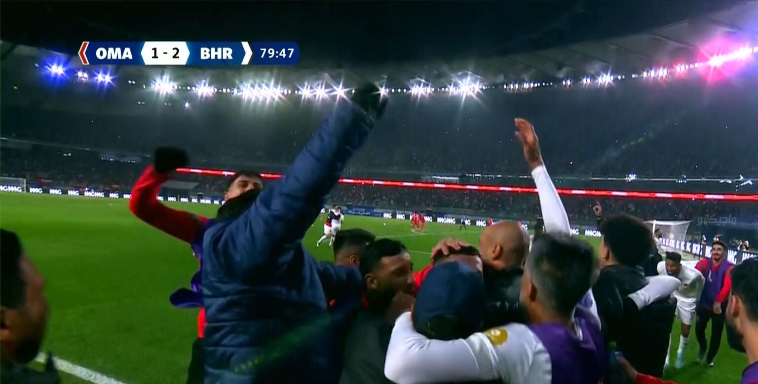 وبعدها بدقيقتين فقط، ارتطمت تسديدة مرهون بالمدافع العماني محمد المسلمي، لتدخل الشباك، وتطلق فرحة كبيرة لجماهير البحرين في المدرجات.