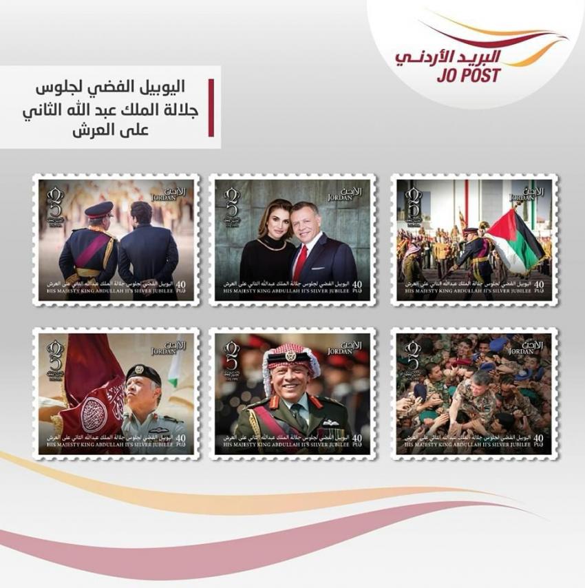 نشامى الاخباري – أصدر البريد الأردني مجموعة من الطوابع بمناسبة مرور 25 عاما على تولي جلالة الملك عبدالله الثاني سلطاته الدستورية ” اليوبيل الفضي”.