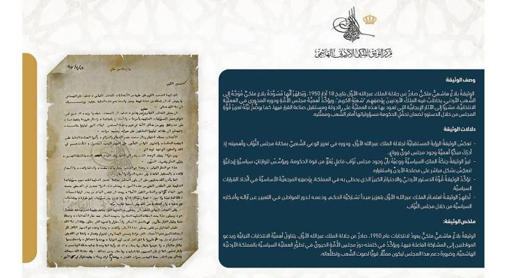 ونشر المركز الوثيقة تزامنا مع الانتخابات النيابية التي تشهدها المملكة، والذي يظهر تأكيد جلالة الملك المؤسس أهمية مجلس النواب ودوره السياسي البارز في تعزيز تطور الحياة السياسية في الأردن.