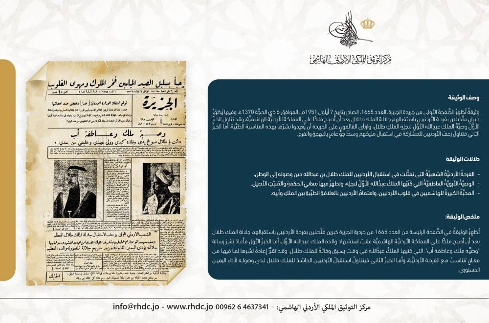 وأوضح المركز في بيان، اليوم الأربعاء، أن الوثيقة هي العدد 1665 من جريدة الجزيرة الصادر بتاريخ 7 أيلول 1951، وتحتوي على خبرين مهمين يتعلق أولهما بإعادة نشر رسالة “وصية ملك وعاطفة أب”، التي كتبها جلالة الملك عبدالله الأول لنجله الملك طلال، والتي تذكر الأردنيين بمعاني الحكمة والعلاقة العميقة بين الملكين، وتعكس مشاعر أبوية حانية وتوجيهات حكيمة، وتعد جزءا مهما من تاريخ المملكة.