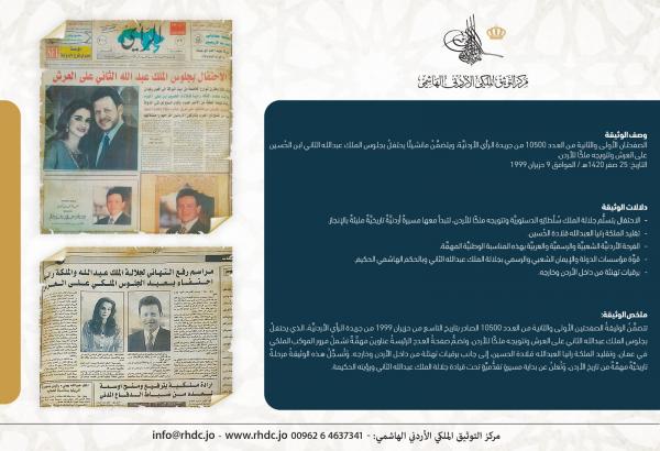 نشامى الاخباري – عرض مركز التوثيق الملكي الأردني الهاشمي، وثيقة تاريخية من أرشيفه تؤرّخ لذكرى الجلوس الملكي والاحتفالات بتولي جلالة الملك عبد الله الثاني سلطاته الدستورية ، وتتضمّن العدد الصادر بتاريخ 9 حزيران 1999 من جريدة الرأي الأردنيّة.