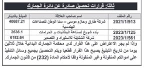 فيما دعت إلى مراجعة مديرية القضايا في الدائرة، لتسوية قرارات المطالبة ودفع الرسوم الجمركية خلال 30 يوما من تاريخ التبليغ، تلافيا لتحصيلها بالطرق القانونية.