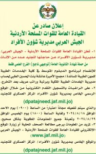 نشامى الاخباري  – أعلنت القيادة العامة للقوات المسلحة الأردنية – الجيش العربي – مديرية شؤون الأفراد، اليوم الخميس، عن حاجتها لتجنيد عدد من الإناث من حملة شهادة الثانوية العامة (توجيهي ناجح) الفرع العلمي للانضمام لبرنامج الدبلوم المتوسط في كلية الخدمات الطبية للمهن الطبية المساندة/ مجمع الأميرة عائشة بنت الحسين الطبي، لحساب مديرية الخدمات الطبية الملكية وبرتبة وراتب عريف بعد التخرج.