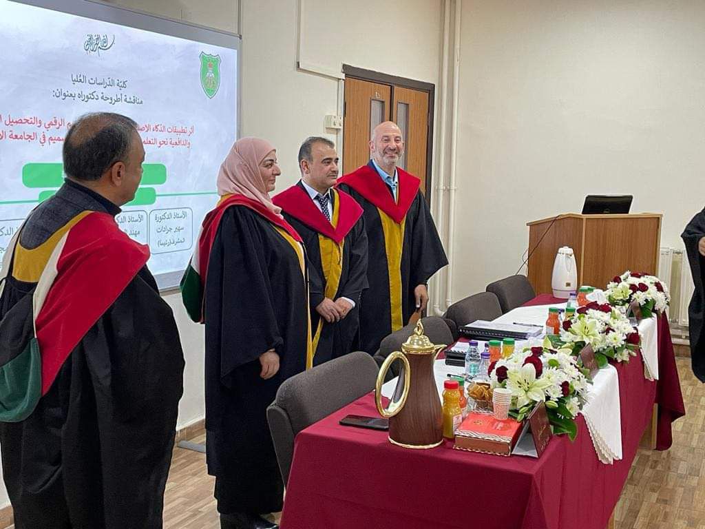 نشامى الإخباري _ أجمل التهاني القلبية تزفها الدكتورة المهندسة رائدة جمال السعايدة وزوجها الدكتور نبيل النمر وأبنائهم إلى شقيقها الدكتور رائد جمال السعايدة ، بمناسبة حصوله على درجة الدكتوراه بامتياز من الجامعة الأردنية، عن أطروحة (أثر تطبيقات الذكاء الاصطناعي في مهارات التصميم الرقمي والتحصيل الدراسي والدافعية نحو التعلم لدى طلبة كلية الفنون والتصميم في الجامعة الأردنية) ، برئاسة الأستاذة الدكتوره سهير جرادات مشرفا وعضوية كل من الدكتور مهند الشبول والدكتور يوسف العاروري والدكتور محمد المجالي مناقشا خارجيا.