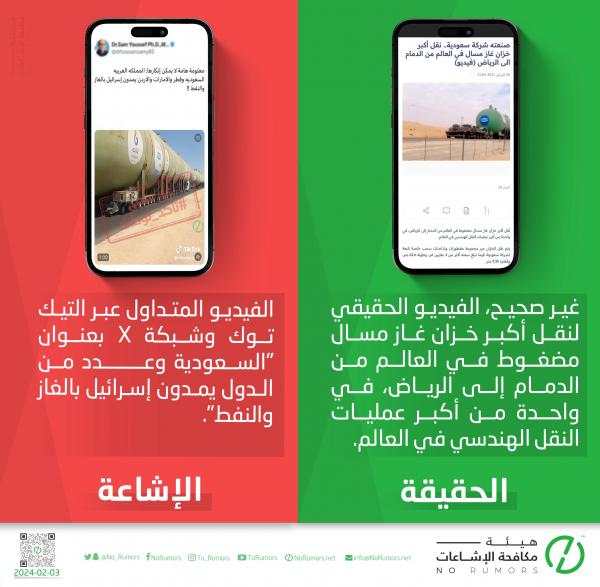 وقالت هيئة مكافحة الإشاعات في السعودية، إنه لا صحة لمقطع الفيديو المتداول بعنوان “السعودية وقطر والإمارات والأردن يمدون اسرائيل بالغاز والنفط”.
