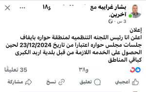 نشامى الإخباري_ أعلن رئيس اللجنة التنظيمية لمنطقة حوارة بمحافظة إربد، بشار الغرابية، إيقاف جلسات المجلس اعتبارا من تاريخ 23/12/2024، وذلك خلال منشور له عبر صفحته الخاصة على فيسبوك.