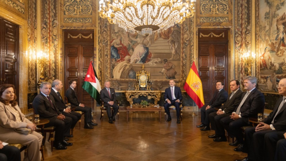 نشامى الاخباري_ عقد جلالة الملك عبدالله الثاني مباحثات مع جلالة الملك فيليب السادس ملك إسبانيا في قصر الحسينية. وكان جلالة الملك استقبل وسمو الأمير الحسين بن عبدالله الثاني، ولي العهد، جلالة الملك فيليب لدى وصوله إلى قصر الحسينية.