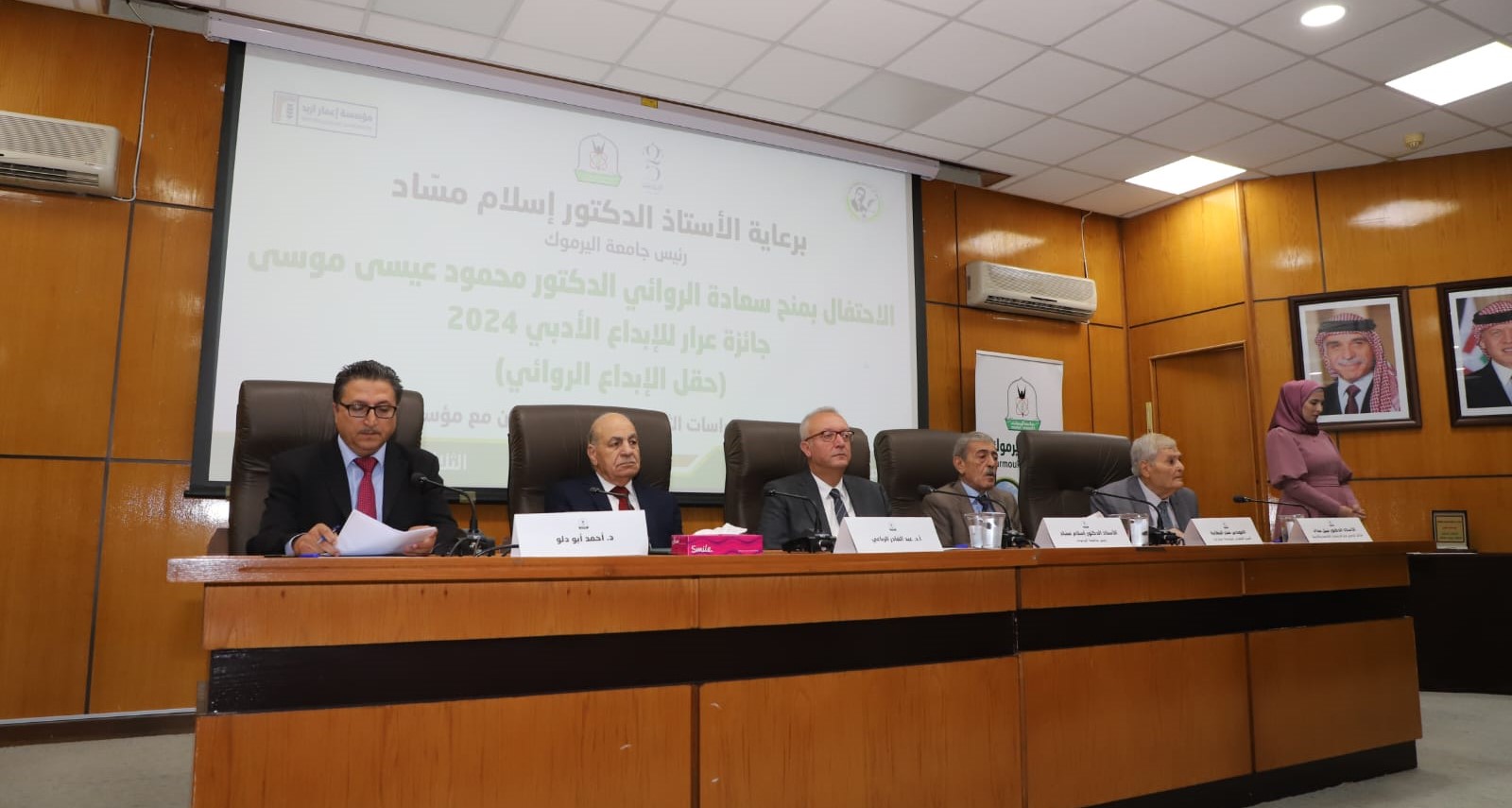 وفي نهاية الحفل الذي حضره نائب رئيس الجامعة للشؤون الأكاديمية الدكتور موسى ربابعة، وعدد من أعضاء الهيئتين التدريسية والإدارية والمهتمين من المجتمع المحلي وجمع من الطلبة، سلم مسّاد الدرع التكريمي وجائزة عرار للإبداع الأدبي للروائي الدكتور محمود عيسى موسى.