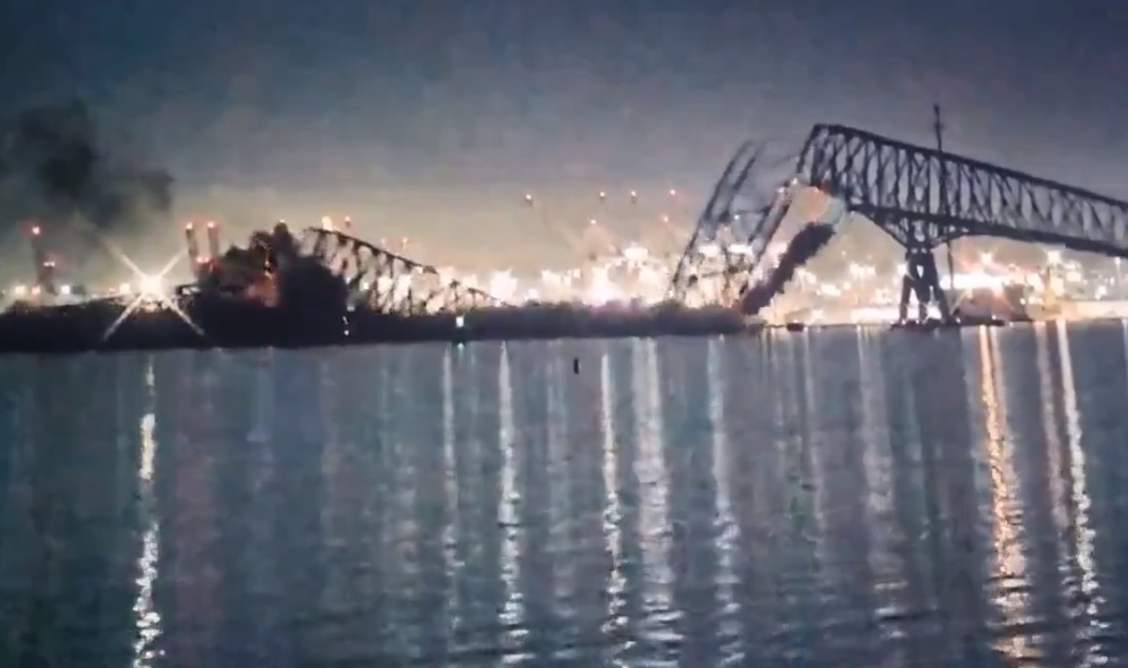 نشامى الاخباري_ انهار جسر “فرانسيس سكوت كي” بمدينة بالتيمور الأميركية في ساعة مبكرة الثلاثاء بعد اصطدام سفينة كبيرة به، على ما ذكرت وسائل إعلام أميركية مشيرة إلى تسجيل مصور للحادثة.