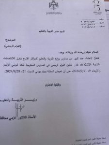 ووجهت الوزارة كتابا إلى مدراء التربية والتعليم على أن يتم تعويض العطلة بدوام يومي السبت 21.28/9/2024.