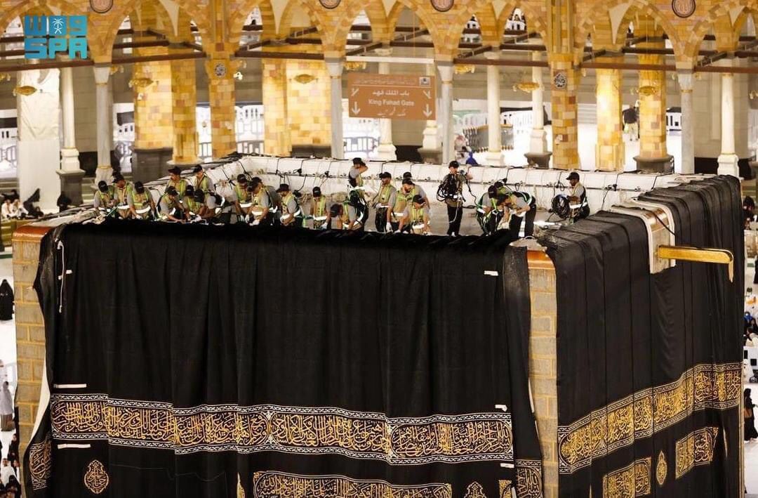 نشامى الاخباري – قامت الهيئة العامة لللعناية بشؤون المسجد الحرام والمسجد النبوي اليوم الاحد، بتغيير كسوة الكعبة المشرفة كما جرت العادة السنوية، وذلك من خلال فريق عمل من مجمع الملك عبدالعزيز لكسوة الكعبة المشرفة يبلغ عدده 159 صانعاً يقومون بتنفيذ عملية التغيير، وموزعون على جوانب وسطح الكعبة المشرفة حسب الاختصاص، حيث بدأ الفريق بتفكيك الكسوة القديمة وتركيب الجديدة، ثم تثبيتها في أركان الكعبة وسطحها.