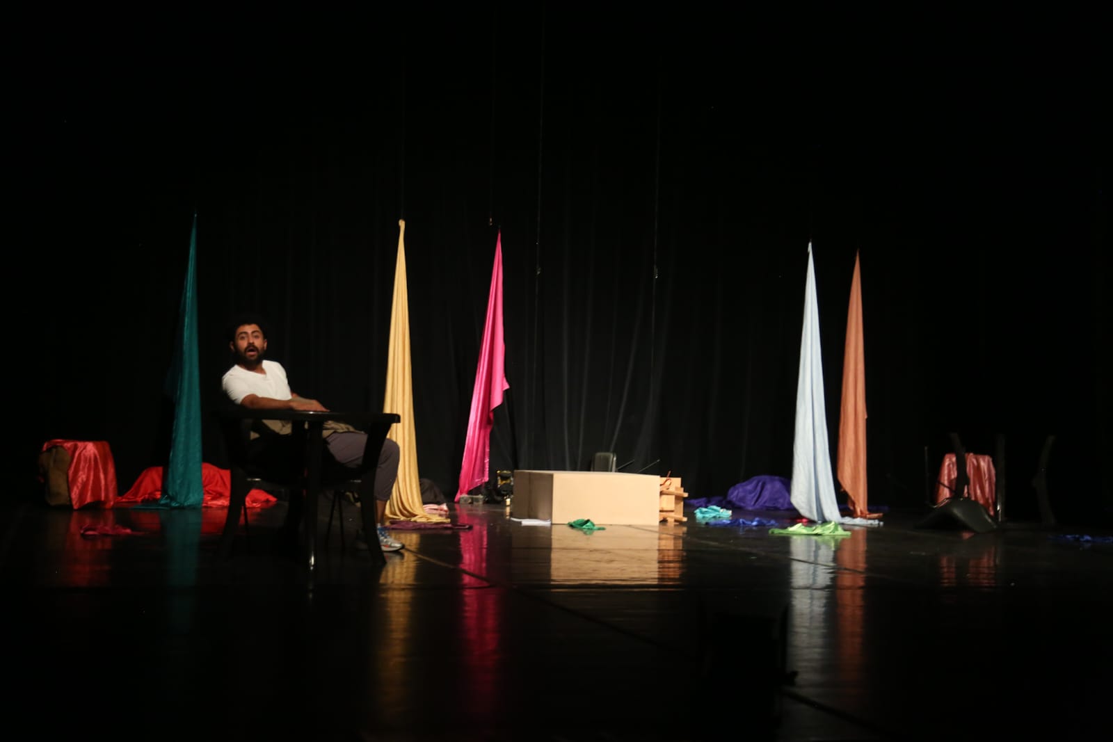 وخلال مدة العرض التي استمرت “40” دقيقة انصت الجمهور لبوح “الفنان” يقدمه “الممثل” بلغة فصحى لم يتخللها الا بضعة كلمات “محلية” واخرى “اعجمية” في توظيف كتابي مدروس لتجسيد الوضع الذي يريد النص طرحه للمشاهد.