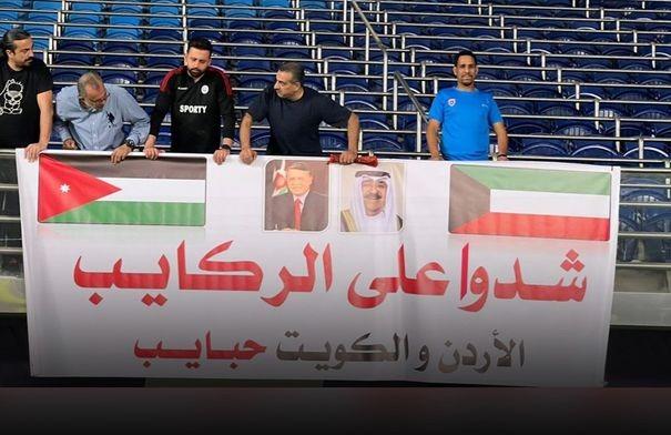 وبينت صورة لافتة من الجماهير قد خط عليها : شدوا على الركايب.. الأردن والكويت حبايب”، مما يعكس طيب العلاقة بين الشعبين قبيل ساعات من انطلاق المباراة بعيدا عن النتيجة.