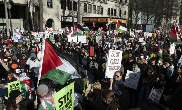 ورفع المتظاهرون الأعلام الفلسطينية، ولافتات تندد بالحرب الإسرائيلية على غزة، وبقتل الأطفال الفلسطينيين، ومحاسبة إسرائيل بارتكاب إبادة جماعية.