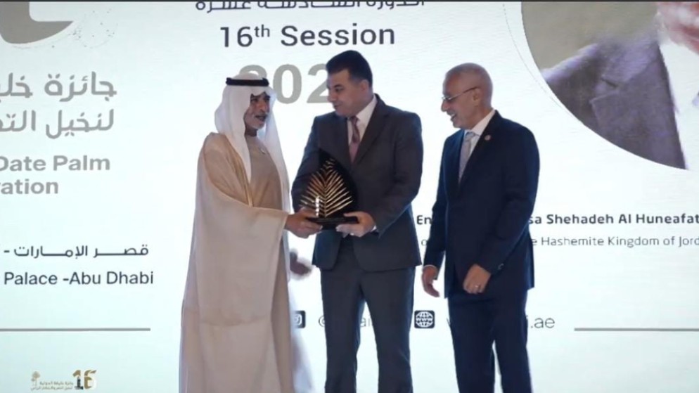 نشامى الاخباري _ كُرم وزير الزراعة خالد الحنيفات، في العاصمة الامارتية أبوظبي عن دورة في تطوير وخدمة قطاع النخيل الأردني في الحفل السنوي لمهرجان خليفة الدولي.