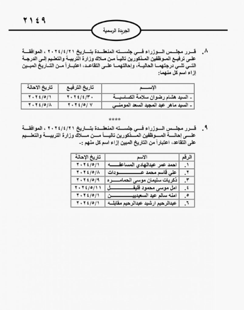 نشامى الإخباري - صدر في عدد الجريدة الرسمية، اليوم الأربعاء، قرارات مجلس الوزراء بإحالة عدد من موظفي الحكومة على التقاعد. وفي ما يلي أسماء المشمولين في الإحالات: