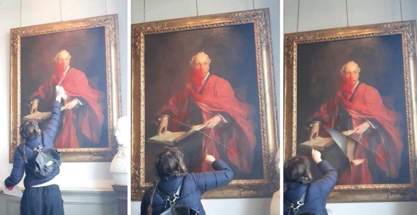 ونشرت “بالستاين أكشن” مقطع فيديو لأحد المتظاهرات وهي تقوم أولًا برش اللوحة، التي رسمها فيليب ألكسيوس دي لازلو عام 1914 لبلفور، باللون الأحمر ثم قامت بتقطيعها بأداة حادة.