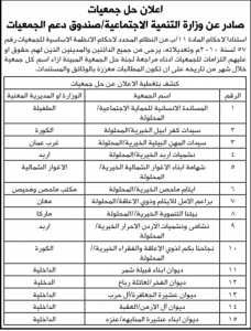 ودعت وزارة التنمية، الدائنين والمدينين الذين لهم حقوق أو عليهم التزامات للجمعيات أناه مراجعة لجنة حلّ الجمعية المبينة إزاء كل جمعية خلال شهر من تاريخه.