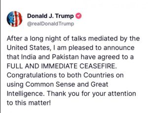 وقال ترامب في منشور له عبر تروث سوشيال، “بعد ليلة طويلة من المحادثات بوساطة الولايات المتحدة، يسرني أن أعلن أن الهند وباكستان اتفقتا على وقف إطلاق نار كامل وفوري. تهانينا لكلا البلدين على استخدام المنطق السليم والذكاء العالي”.