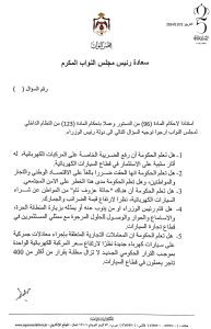 واستفسر العرموطي عن اسباب رفع الضريبة الخاصة والتسبب بحالة من العزوف عن شراء السيارات الكهربائية، وإذا ما زار الرئيس المنطقة الحرة، وإذا ما كان هنالك نية للتراجع عن القرار، وعن التشاور مع التجار وأصحاب العلاقة.