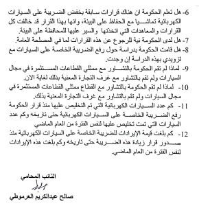 6- هل تعلم الحكومة ان هناك قرارات سابقة بخفض الضريبة على السيارات الكهربائية تماشيا مع الحفاظ على البيئة، وانها بهذا القرار قد خالفت كل القرارات والمعاهدات التي اتخذتها والسير عليها للمحافظة على البيئة.
