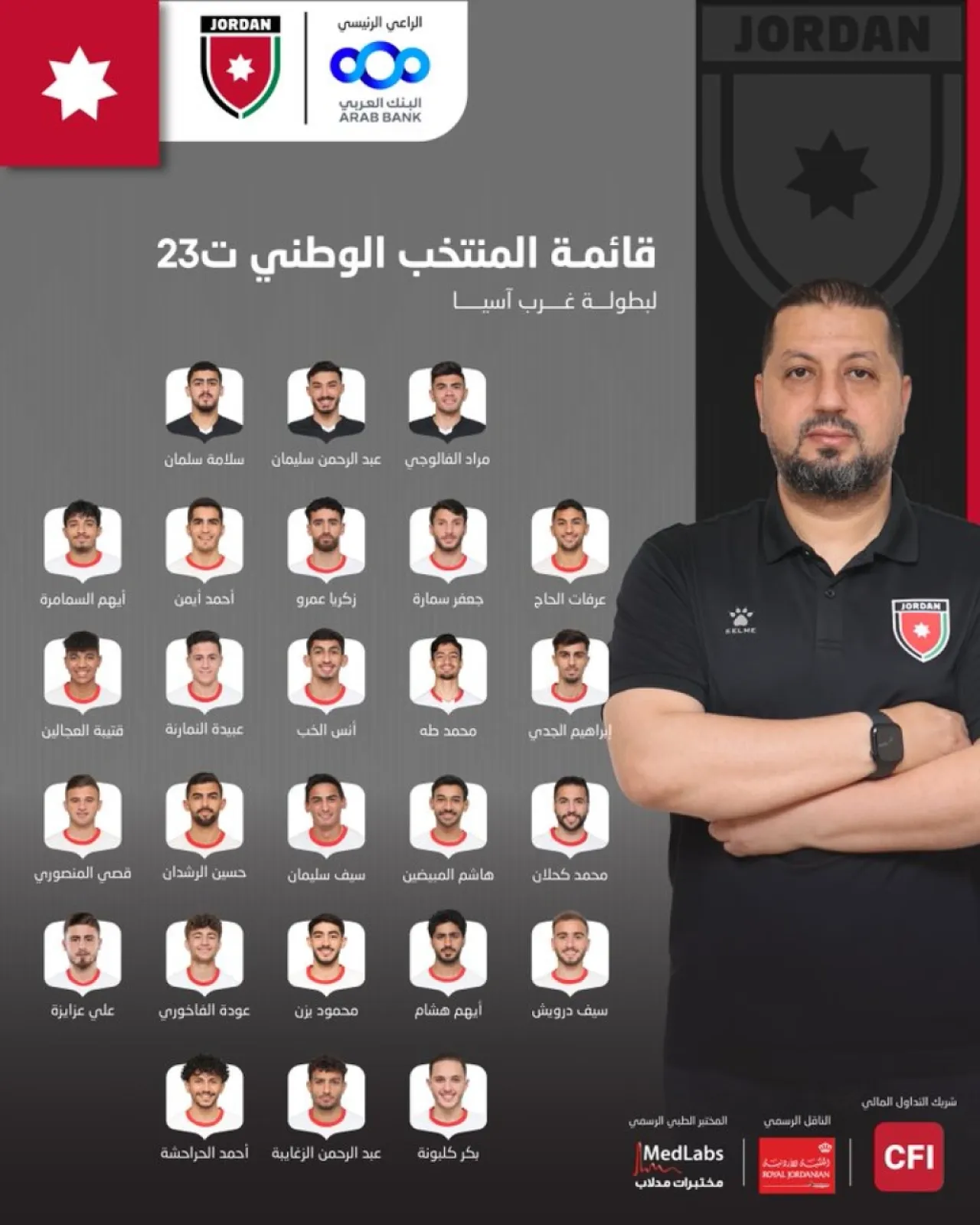 نشامى الاخباري – أعلن الجهاز الفني للمنتخب الوطني ت23 بقيادة المدرب عمر نجحي، قائمة ضمت 26 لاعباً للمشاركة في بطولة غرب آسيا – عُمان والتي تقام من 19 حتى 25 آذار في العاصمة مسقط.