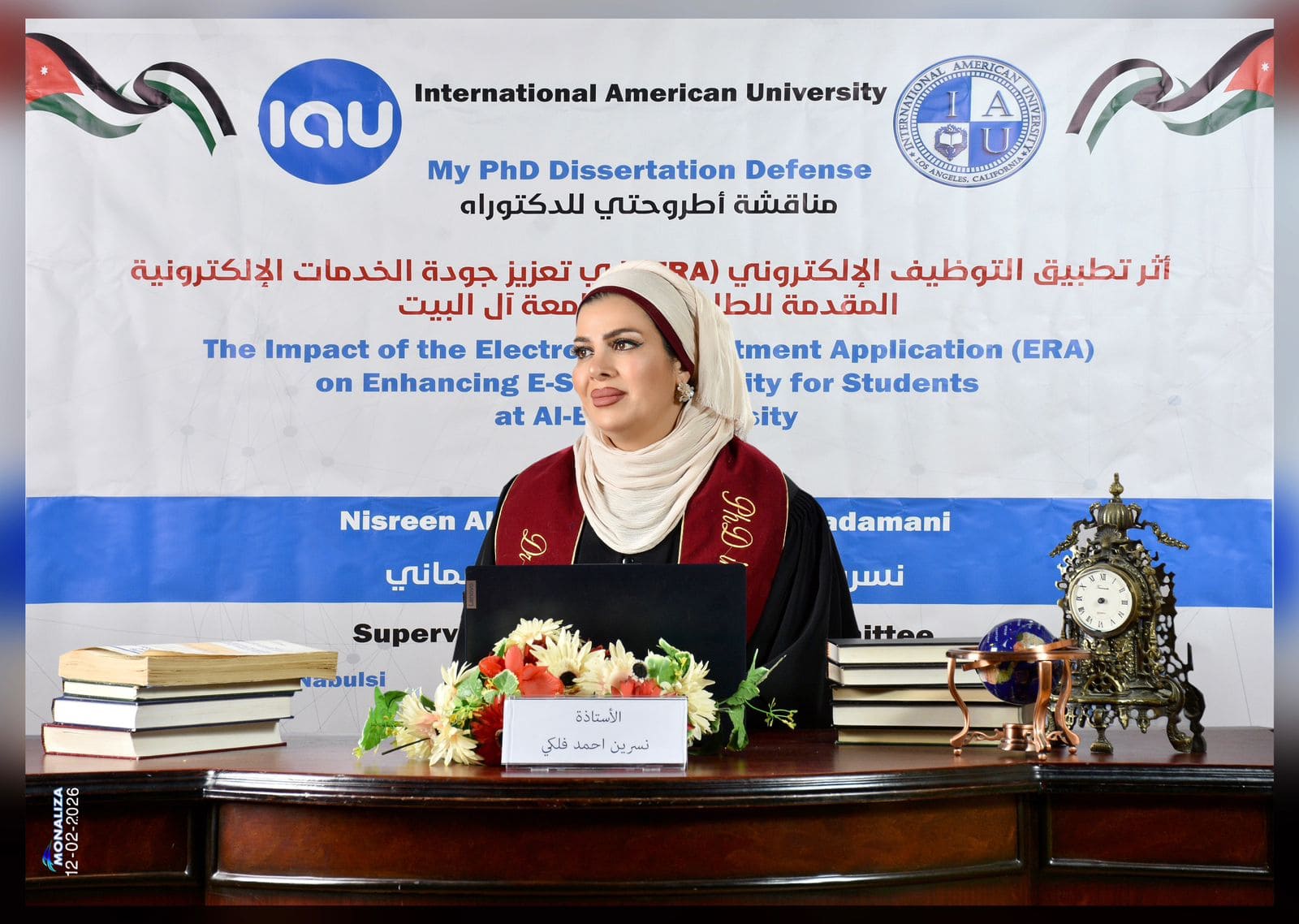 نشامى الاخباري _ يتقدم أحمد الحوامدة بالتهنئة والتبريك إلى الدكتورة نسرين أحمد فارس القضماني لحصولها على درجة الدكتوراه في إدارة الأعمال من الجامعة الأمريكية الدولية بتقدير ممتاز (+A).