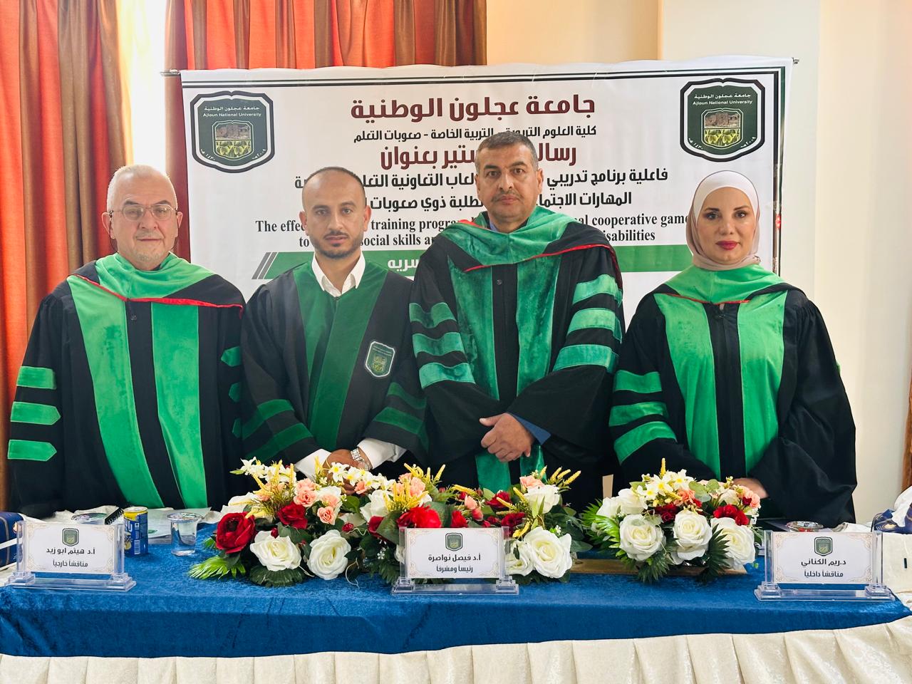 نشامى الاخباري _ ‏نوقشت في كلية العلوم التربوية/قسم التربية الخاصة بجامعة عجلون الوطنية رسالة الماجستير في صعوبات التعلم، حيث جاءت الرسالة مقدمة من الباحث علاء مشرف علي أبو سرية بعنوان : ‏فاعلية برنامج تدريبي قائم على الألعاب التربوية التعليمية لتنمية المهارات الاجتماعية لدى طلبة صعوبات التعلم.
