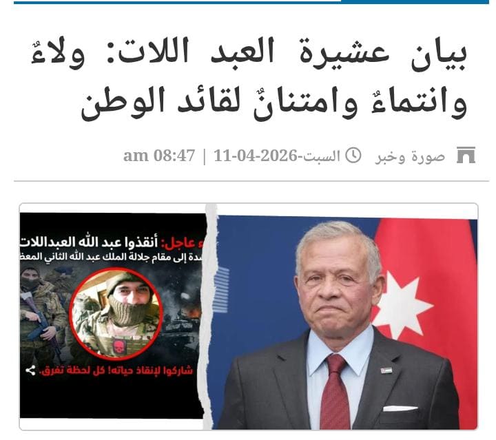 نشامى الاخباري _ تتقدم عشيرة العبد اللات بأسمى آيات الشكر والتقدير والامتنان إلى مقام حضرة صاحب الجلالة الملك عبد الله الثاني ابن الحسين المعظم، حفظه الله ورعاه، وإلى سمو ولي العهد الأمين، على استجابتهم الكريمة لنداء أبناء العشيرة، وسماع صوتهم، وتدخلهم السامي لإعادة ابنهم المغترب، عبد الله كايد هايل العبد اللات، إلى أحضان الوطن الغالي، أرض الأجداد والكرامة.