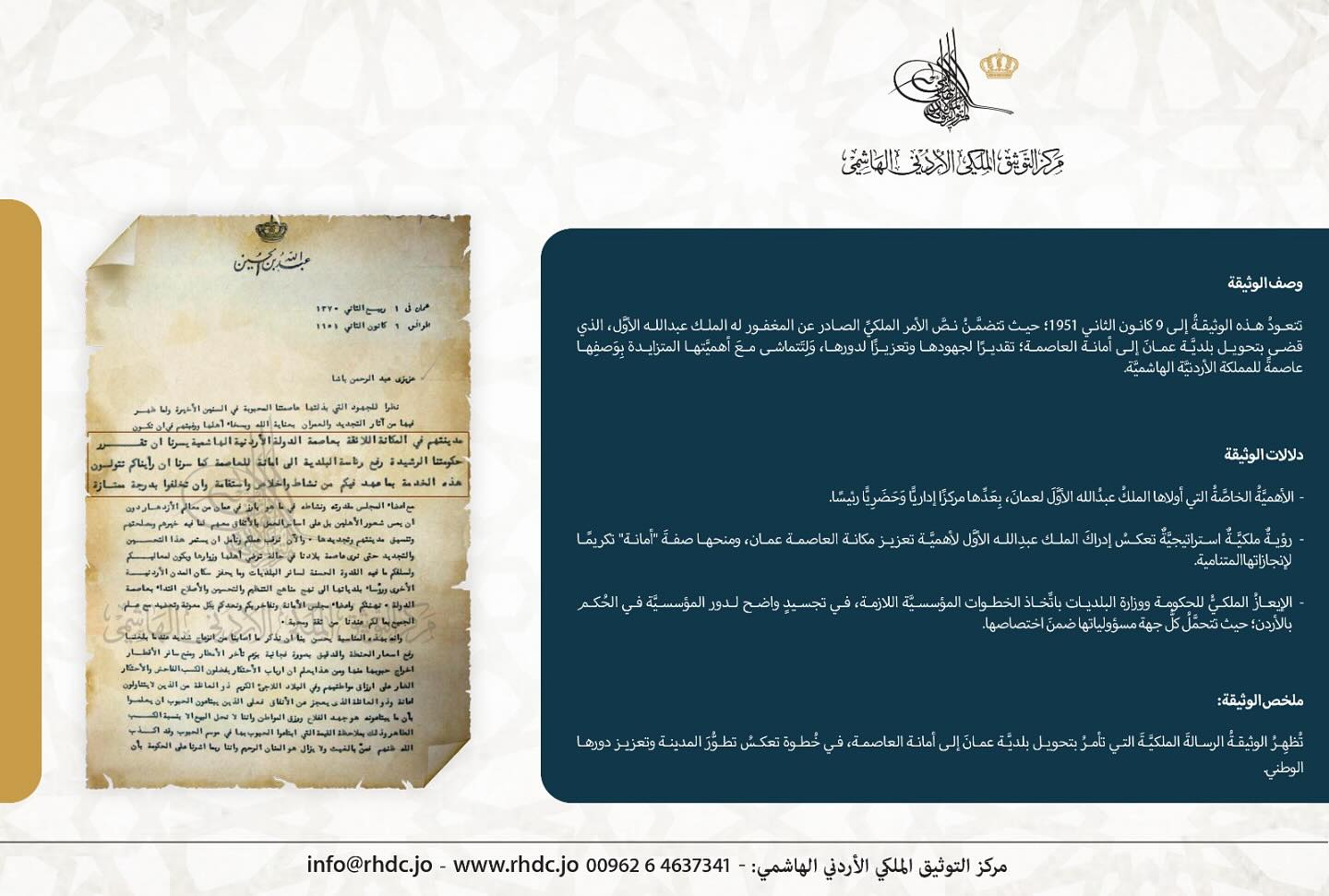 نشامى الاخباري – نشرَ مركزُ التوثيق الملكي الأردني الهاشمي وثيقةً تاريخيَّةً تُظهِرُ نصَّ الرسالة الملكيَّة التي أصدرها الملكُ عبدُالله الأوَّلُ ابنُ الحُسين بتاريخ التاسع من كانون الثاني 1951، التي قَضَت بتحويل بلديَّة عمانَ إلى أمانة العاصمة، في خُطوة تعكسُ التطوَّرَ الذي شَهِدَتهُ العاصمةُ الأردنيَّةُ وتقديرًا لجهود بلديتها في خدمة المواطنين.