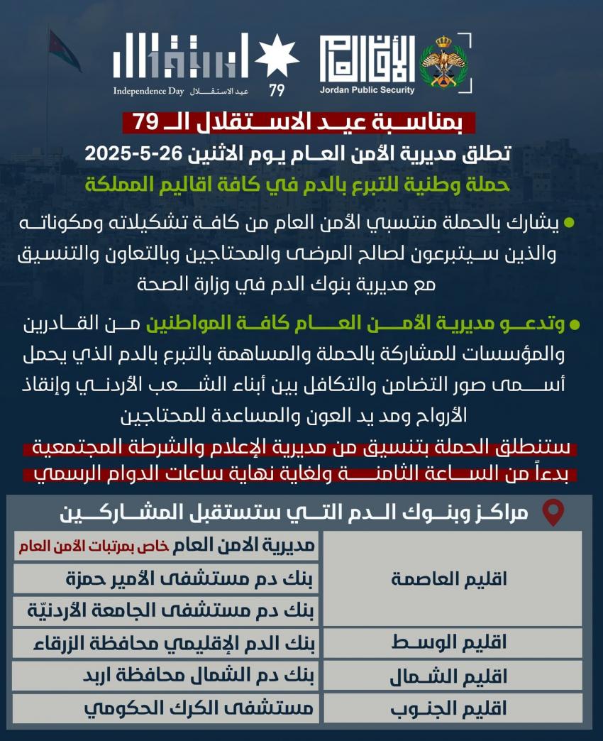 نشامى الاخباري  – تطلق مديرية الأمن العام يوم غدٍ الاثنين 26-5-2025 حملة وطنية للتبرع بالدم في كافة اقاليم المملكة، بمناسبة عيد الاستقلال الــ79 .