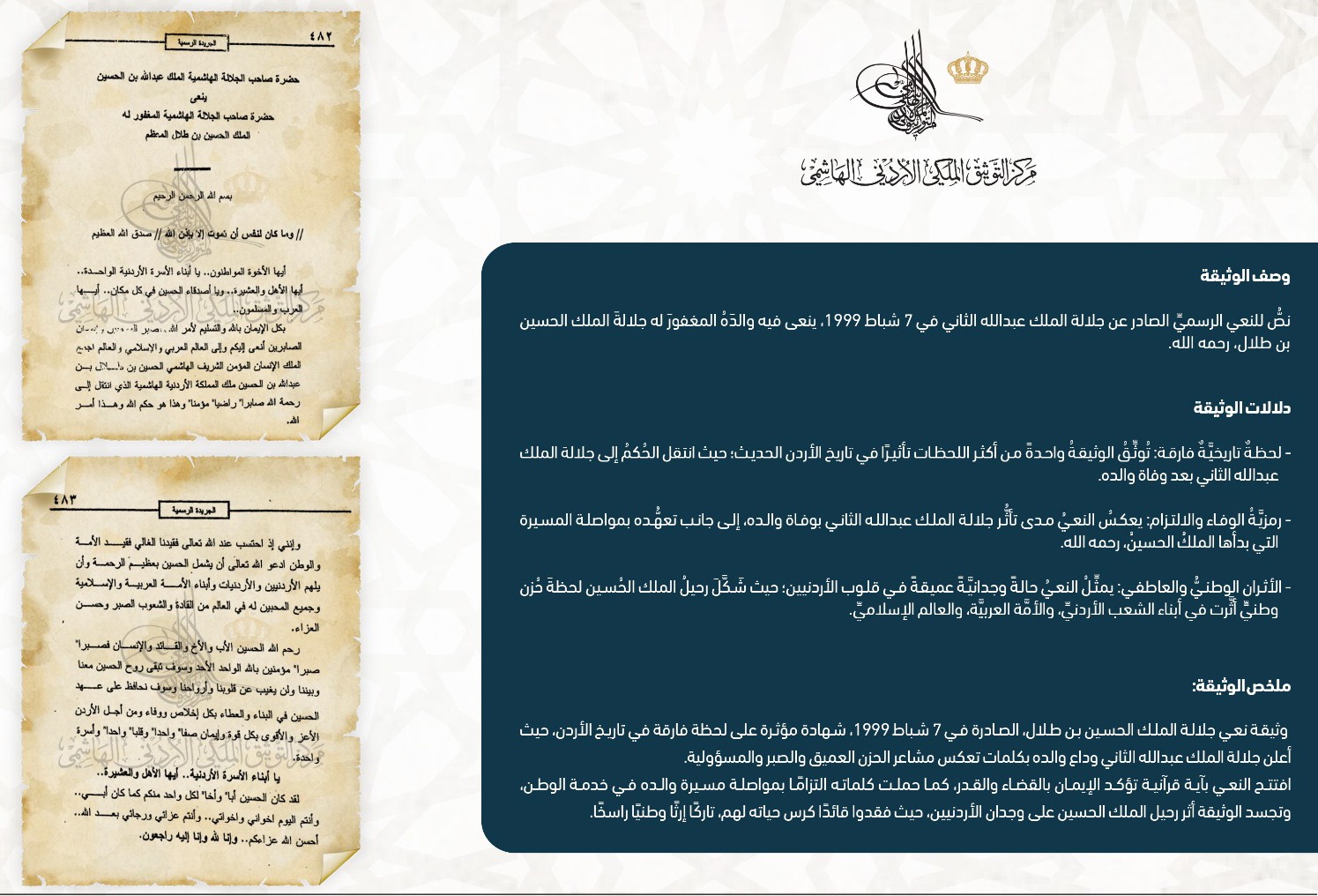 التوثيق الملكي يعرض وثيقة نعي جلالة الملك الحسين بن طلال
