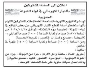 وسيتم فصل التيار الكهربائي خلال فترات محددة، وفق جدول زمني معلن لكل منطقة متأثرة، على أن تُستأنف الخدمة مباشرة بعد الانتهاء من أعمال الصيانة.