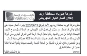 فصل مبرمج للكهرباء في عدد من مناطق إربد