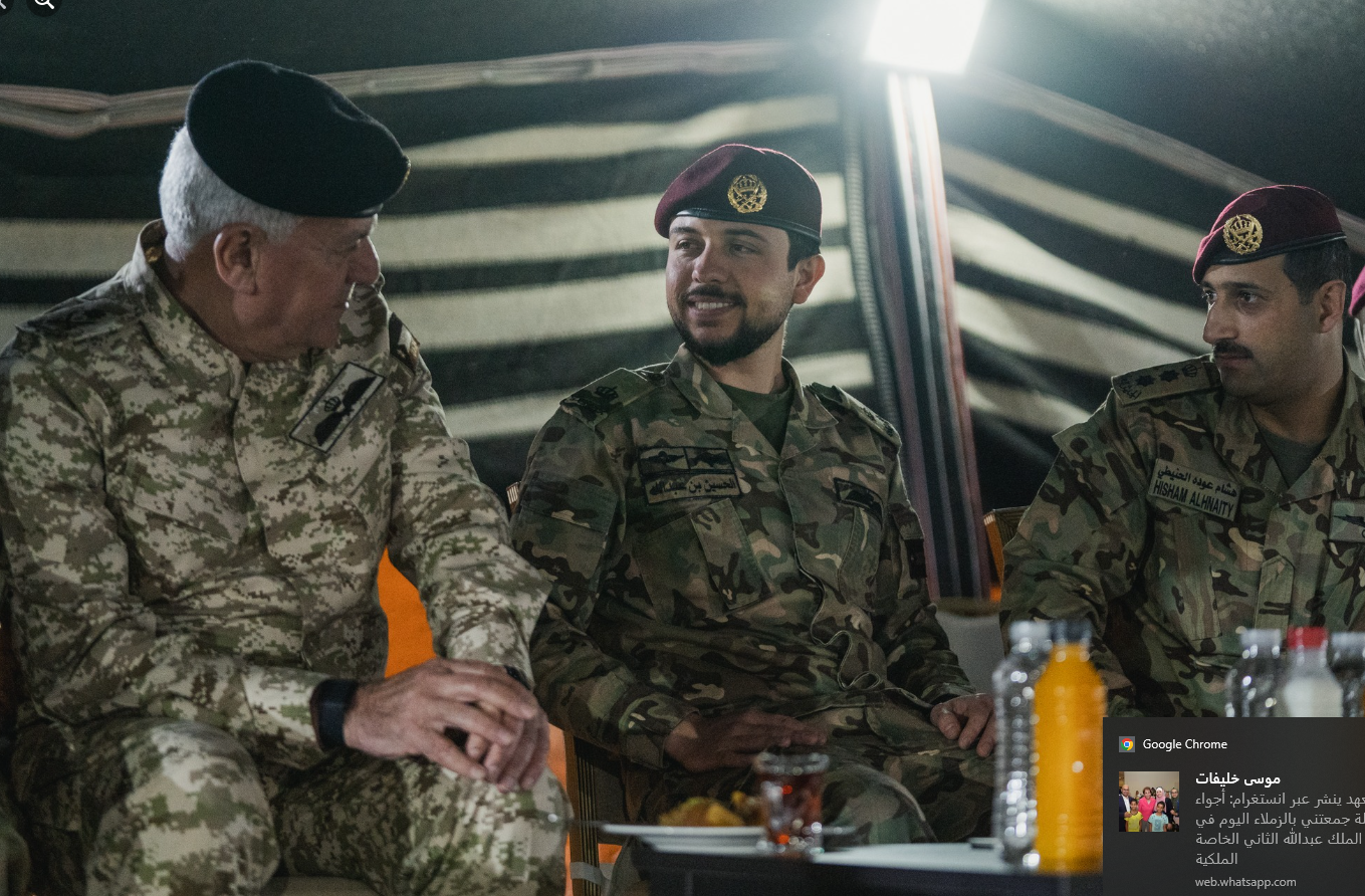 وكان في استقبال سمو ولي العهد لدى وصوله، رئيس هيئة الأركان المشتركة اللواء الركن يوسف أحمد الحنيطي، وقائد قوات الملك عبدالله الثاني الخاصة الملكية.