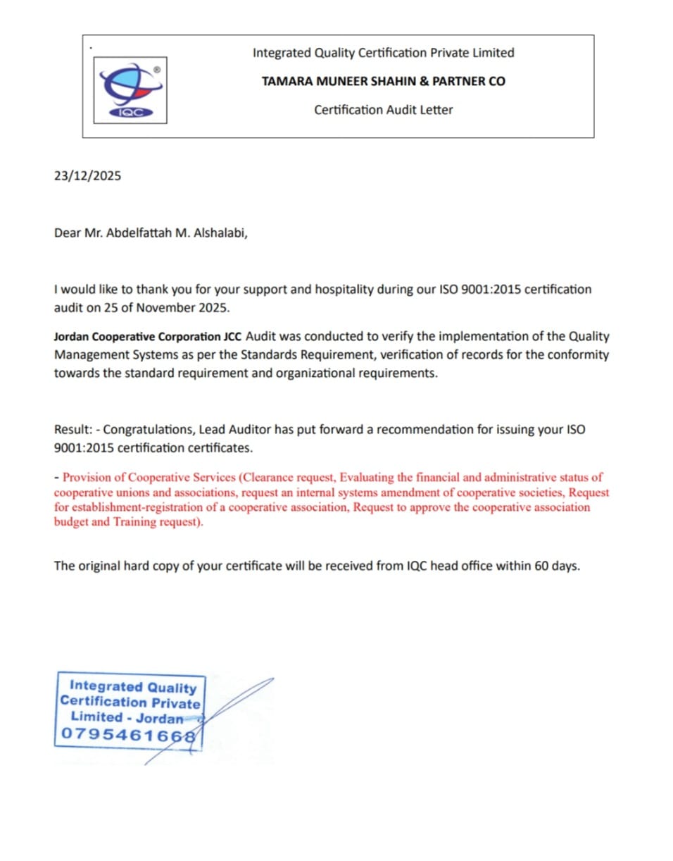 نشامى الاخباري _ حصلت المؤسسة التعاونية الأردنية على شهادة نظام إدارة الجودة ( ISO 9001:2015) من قبل منظمة (JASANZ)، وذلك بعد خضوعها لتدقيق شامل من قبل شركة (IQC (Integrated Quality Certification Private Limited/، والتي تُعدَّ من الشركات المحلية الرائدة في مجال اختبارات الفحص، والتدقيق الخارجي، والتحقق، والمطابقة.