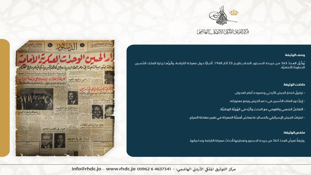 وقال المركز في بيان الخميس، إن الوثيقة تُظهر الصفحة الرئيسة من العدد 343 من جريدة الدستور التي يتصدرها خبر زيارة الملك الحسين للوحدات العسكرية الأمامية بعد المعركة وإشادته ببسالة الجيش وتهنئته بالنصر، بالإضافة إلى تناولها آثار المعركة وفرح الأردنيين والتوحد القومي العربي واعتراف الجيش الإسرائيلي بخسائره.