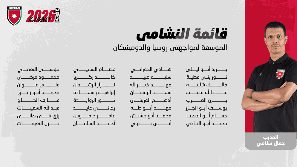 نشامى الاخباري _  أعلن الجهاز الفني للمنتخب الوطني بقيادة المدرب جمال سلامي، قائمة أولية ضمت 32 لاعبا، استعدادا لمواجهتي روسيا والدومينيكان وديا، في إطار التحضيرات لخوض نهائيات كأس العالم 2026.