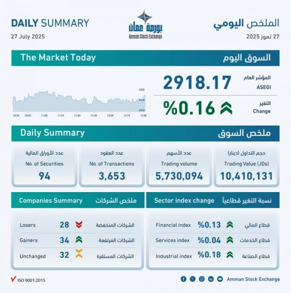 وبلغت الأسهم المتداولة 5.7 مليون سهم، بقيمة 10.4 مليون دينار نتيجة عقد 3653 صفقة.