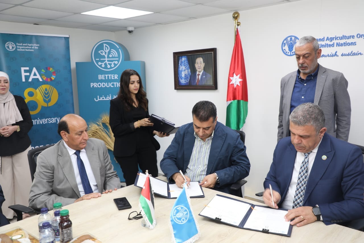 كما وقّع وزير الزراعة خالد الحنيفات، وممثل منظمة الأغذية والزراعة نبيل عساف اتفاقية إضافية لتعزيز مهارات المزارعين في مجال الممارسات الزراعية الذكية في مواجهة التغير المناخي للمزارعين في محافظات مادبا والكرك والطفيلة ومعان.